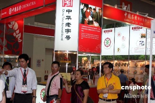 “臺北國際食品展”六月十八日在臺北世貿南港展覽館開幕。此屆食品展有七百六十八家廠商參展,使用一千六百零九個攤位,其中,大陸有三十九家廠商參展。圖為中茶公司在“臺北國際食品展”布置的引人注目的攤位,臺灣民眾對臺灣不出產的普洱茶頗感興趣。 中新社發 耿軍 攝