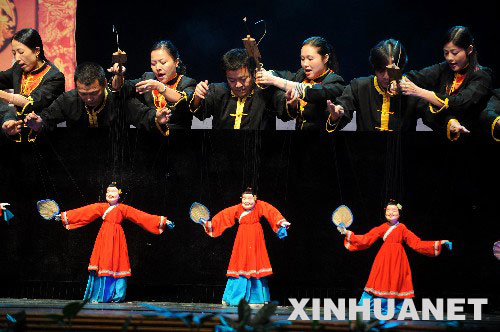 11月26日,福建省泉州市木偶劇團和漳州市木偶劇團的演員在表演木偶劇《嘉禮獻瑞》。當日,首屆海峽兩岸(廈門)文化產業博覽交易會開幕式文藝晚會在廈門人民會堂舉行,來自海峽兩岸的藝術家同臺演出,共敘文緣。 新華社記者 姜克紅 攝