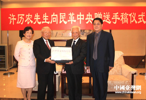 臺灣新同盟會會長許歷農(nóng)(左二)向民革中央主席周鐵農(nóng)贈送手稿。(中國臺灣網(wǎng) 高斯斯 攝)