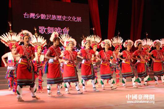 作為臺灣少數民族歷史文化展活動的組成部分,一場“臺灣少數民族原生態歌舞晚會”21晚在全國政協禮堂上演。(中國臺灣網 鐘寶華 攝)
