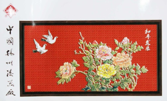 池家俊說, 《和平發(fā)展》運(yùn)用雕漆嵌玉技藝,采用白玉、翡翠、瑪瑙等多種名貴的用料,屏中雍容華貴的牡丹,象征兩岸關(guān)系花團(tuán)錦簇,共同繁榮;比翼飛翔的白鴿,比喻兩岸同胞和衷共濟(jì)、相互扶持的深情厚意,寓意兩岸和平;白鴿與牡丹組成的畫面,則寓意兩岸“和平發(fā)展”。
