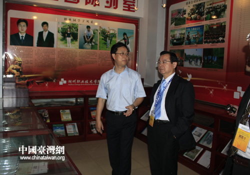 臺灣嶺東科技大學考察團參觀湖州職業(yè)技術學院創(chuàng)業(yè)園陳列室(圖片來源:湖州市臺辦)