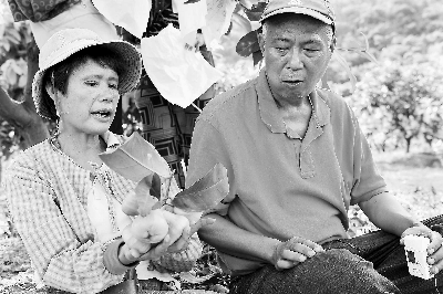 圖為何文淵夫婦倆席地而坐,探討蓮霧的色澤和質(zhì)量。圖片來源:福建日報