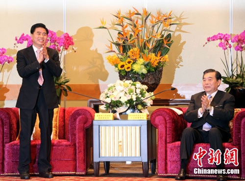 8月16日,廣東省省長黃華華(左)率團到臺北參加“臺灣·廣東周”活動。他在與臺北世貿中心董事長王志剛(右)及臺灣工商企業界人士會面時強調,廣東的發展與臺灣同胞的大力支持分不開。中新社發 劉舒凌 攝