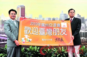 萬慶良向臺灣同胞致送亞運(yùn)會邀請函。