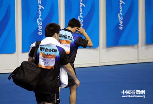 18日上午,廣州亞運會乒乓球比賽男雙1/8決賽,中華臺北隊名將莊智淵和吳志祺搭檔,不敵越南的段建國與丁廣靈組合,以1-3輸掉比賽,無緣8強。圖為兩人黯然離場。(中國臺灣網 鐘寶華 攝)