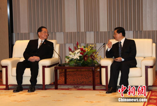 當地時間2010年11月13日上午9時,中共中央總書記胡錦濤在橫濱下榻飯店內會見中國國民黨榮譽主席連戰。胡錦濤12日傍晚抵達日本橫濱,出席在這里舉行的亞太經合組織(APEC)領導人第18次非正式會議。中新社記者 張朔 攝