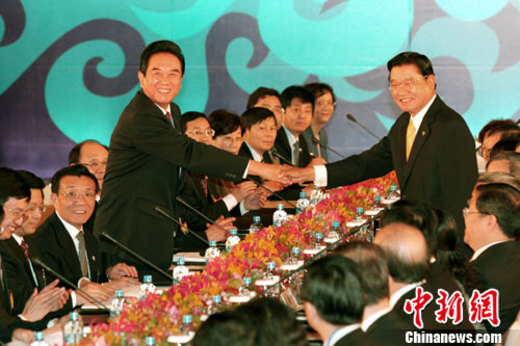 12月21日上午,海協會會長陳云林與海基會董事長江丙坤的兩會領導人第六次會談在臺北圓山飯店舉行。圖為陳江二人在會談開始時相互握手致意。 中新社記者 黃少華 攝