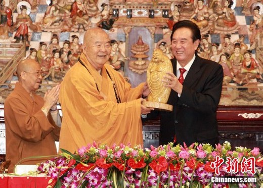 2月24日下午,大陸海協會會長陳云林一行來到有“南臺佛都”之稱的高雄佛光山參訪,受到星云法師及僧眾的熱烈歡迎。圖為陳云林(右)向星云法師贈送木雕佛像。中新社記者 符永康 攝