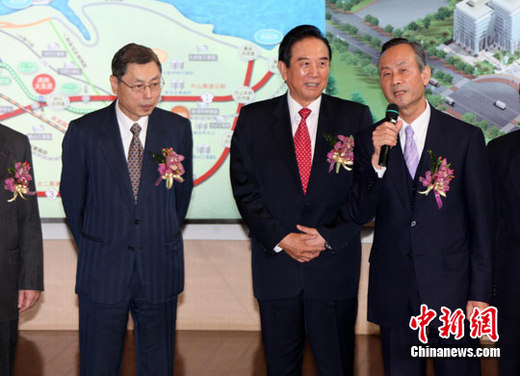 2月27日上午,正在臺灣參訪的大陸海協會會長陳云林一行分別到臺北港、遠雄自由貿易港區參觀考察。圖為陳云林(中)在臺灣;鶗倍麻L高孔廉(左一)陪同下參觀位于桃園縣大園鄉的遠雄自由貿易港區,遠雄企業團董事長趙藤雄(右一)作現場介紹。中新社記者 符永康 攝