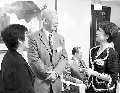 胡葆琳(右)、黃慧南(左)與臺灣退役上將交談。 連錦添攝
