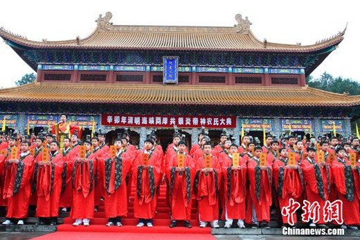 “辛卯年清明海峽兩岸共祭炎帝神農氏大典”4月3日在中華始祖炎帝安寢地湖南株洲炎帝陵舉行,參加第二屆“在臺湘籍后裔湖南行”活動的臺灣鄉親及社會各界人士共200多人祭拜炎帝神農氏。圖為千人頌唱《祭炎帝》。中新社發 劉柱 攝