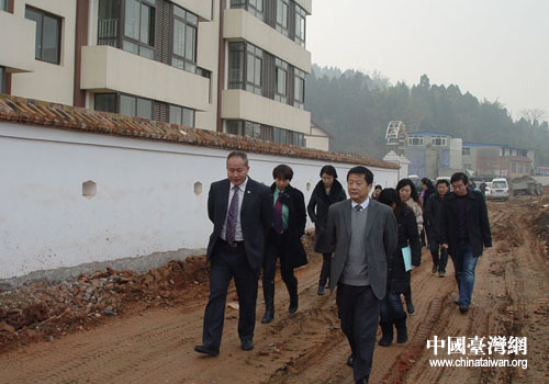 德陽市臺辦主任獨遠程(前右1)陪同林郁華協(xié)理(前左1)等來賓參觀即將竣工的新福利院。(德陽市臺辦 甘和林 攝)