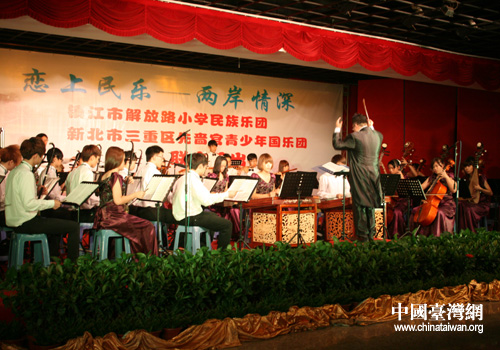 中國臺灣網8月23日鎮江消息 8月22日,來自臺灣新北市三重區先嗇宮青少年國樂團與鎮江市解放路小學民族樂團在鎮江市工人文化宮聯合舉辦了一場“戀上民樂——兩岸情深”海峽兩岸青少年民樂交流演出。鎮江市副市長曹麗虹與江蘇省、鎮江市有關部門領導,鎮江市臺屬聯誼會會員,應邀到鎮江的常州市臺商代表及鎮江市解放路小學部分師生代表共300多人一同欣賞了這場精彩的演出。