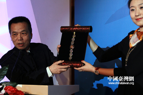 洽談會上,來自臺灣的許伯夷特意捐贈了一塊造型精美、價值不菲的名表,祝賀兩岸在文創產業人才方面展開合作。(中國臺灣網 楊麗 攝)