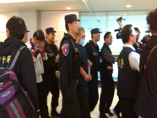 朱姓和胡姓男子在警方人員重重戒護,兩人分別銬上手銬,其中一人還上腳鐐,以防萬一。兩人戴著口罩,用雙手捂著臉,在機場一路上低頭不語。臺“刑事局”隨后將兩人押上車,離開桃園機場。(中國臺灣網 周劍)