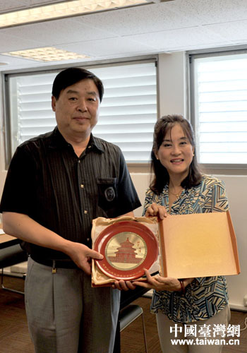 北京市臺(tái)辦副主任高振生和臺(tái)中市新聞局局長石靜文交換禮物。