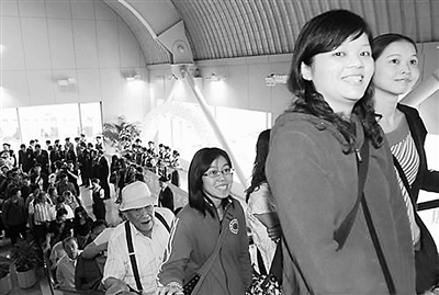 越來越多臺胞往來兩岸。圖為臺灣旅客乘包機抵達北京的情景。資料照片