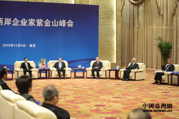 由兩岸企業家峰會主辦的2015兩岸企業家紫金山峰會3日至4日在江蘇南京舉行。中共中央政治局常委、全國政協主席俞正聲出席會議,并在會議期間會見了蕭萬長等臺灣參會主要代表。(中國臺灣網 扶海濤 攝)