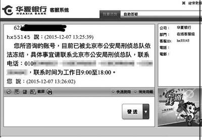 小王提供給北青報記者的華夏銀行客服系統的回復中顯示:“您所咨詢的賬號,目前已被北京市公安局刑偵總隊依法凍結,具體事宜請聯系北京市公安局刑偵總隊”。