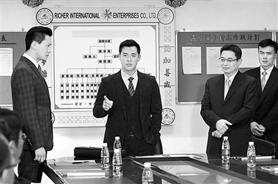 該劇男主角竇智孔(左二)飾演的臺商原型——東莞臺商張朝宗(右二)也在劇中客串。(圖片來自劇組)