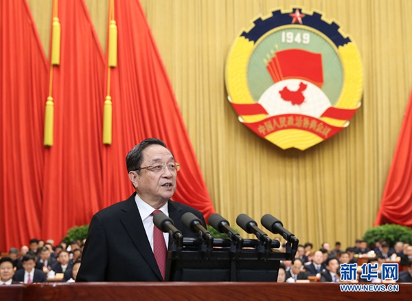 3月3日,中國人民政治協商會議第十二屆全國委員會第四次會議在北京人民大會堂開幕。這是俞正聲代表政協第十二屆全國委員會常務委員會作工作報告。 新華社記者 龐興雷 攝
