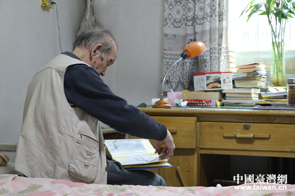 93歲種志斌,坐在床頭翻看老照片。(中國臺灣網 扶海濤 攝)