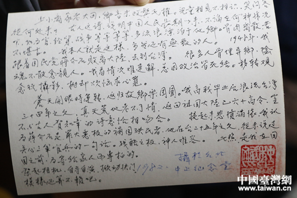 在照片背面,種志斌寫道:“蒼天開眼時運轉,返歸故鄉樂團圓。”(中國臺灣網 扶海濤 翻攝)