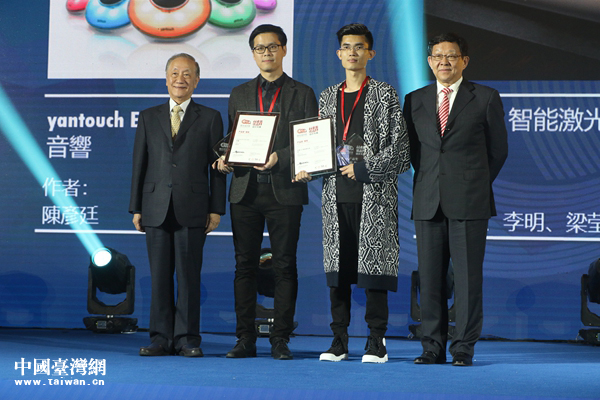 海峽兩岸關(guān)系協(xié)會會長陳德銘、臺灣新黨主席郁慕明為產(chǎn)品組銀獎獲得者頒獎。(中國臺灣網(wǎng) 尹賽楠攝 )