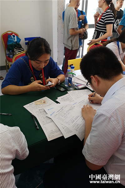 為了讓更多學生體驗移動支付,今年組委會邀請中國移動公司、海峽銀行工作人員在營地聯(lián)合辦公,便捷臺青開通移動支付。基于辦理人數(shù)激增,中國移動公司和海峽銀行工作人員10日也增添了1組工作人員,以便快速幫助臺青辦理移動支付。