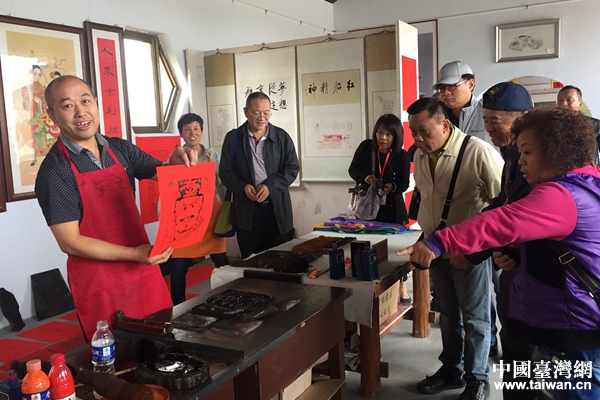 參訪團成員參觀木版年畫制作。(中國臺灣網 許晗 攝)