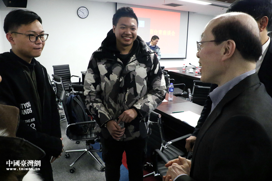 1月16日,中央臺辦、國務(wù)院臺辦主任劉結(jié)一與安徽省合肥市當(dāng)?shù)嘏_商、臺青、臺籍師生等各界臺胞交流座談。圖為劉結(jié)一主任在座談會后與臺灣青年親切交談。(中國臺灣網(wǎng) 尹賽楠 攝)