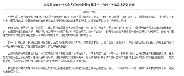 中國駐印度大使館就印媒播出“臺(tái)獨(dú)”專訪發(fā)表嚴(yán)正聲明