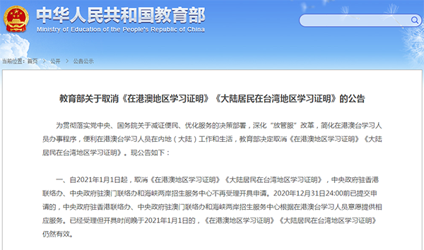 根據(jù)公告,自2021年1月1日起,取消《在港澳地區(qū)學(xué)習(xí)證明》《大陸居民在臺灣地區(qū)學(xué)習(xí)證明》,中央政府駐香港聯(lián)絡(luò)辦、中央政府駐澳門聯(lián)絡(luò)辦和海峽兩岸招生服務(wù)中心不再受理開具申請。2020年12月31日24:00前已提交申請的,中央政府駐香港聯(lián)絡(luò)辦、中央政府駐澳門聯(lián)絡(luò)辦和海峽兩岸招生服務(wù)中心根據(jù)在港澳臺學(xué)習(xí)人員意愿提供相應(yīng)服務(wù)。已經(jīng)受理但開具時間晚于2021年1月1日的,《在港澳地區(qū)學(xué)習(xí)證明》《大陸居民在臺灣地區(qū)學(xué)習(xí)證明》仍然有效。