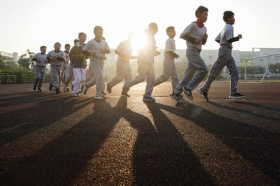 ↑在儀征市新集中心小學,隊員在訓練前跑步熱身(4月9日攝)。新華社記者 季春鵬 攝