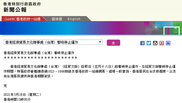 港府公報:香港經濟貿易文化辦事處(臺灣)暫時停止運作