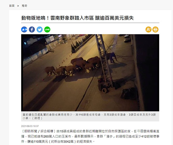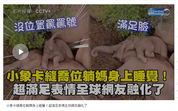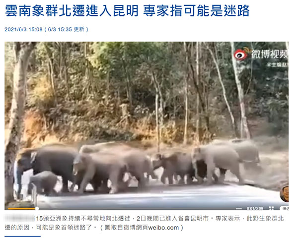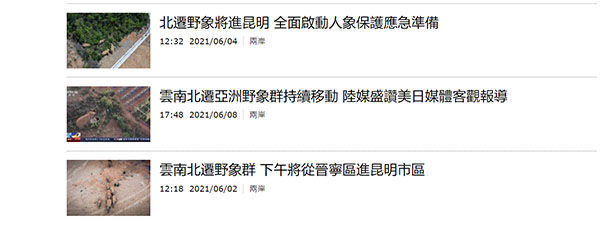 “中時新聞網”自5月底就開始關注,并陸續發布多篇文章,還將此次野象的“北遷”之旅稱為“長征”,從野象群的遷徙路線,當地政府保護舉措,專家觀點,包括野象群發生的見聞趣事均做了詳細報道。