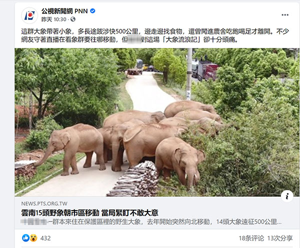 由17頭亞洲野象(含中途出生的一只小象)組成的“遷徙大軍”自云南西雙版納出發,一路往北方前進,超過400多公里、歷時一年多終于進入到了昆明,引發全球關注。島內包括“中央社”、《聯合報》、“中時新聞網”、《自由時報》、公視新聞等在內的各家媒體發布多篇文章追蹤事件進展。