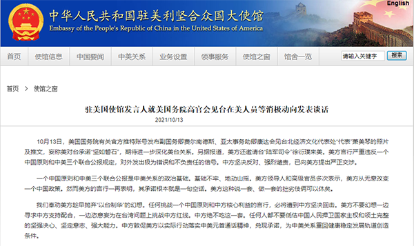 中國駐美使館發(fā)言人就美國務(wù)院高官會(huì)見臺在美人員等消極動(dòng)向發(fā)表談話。(中國駐美大使館官網(wǎng)截圖)