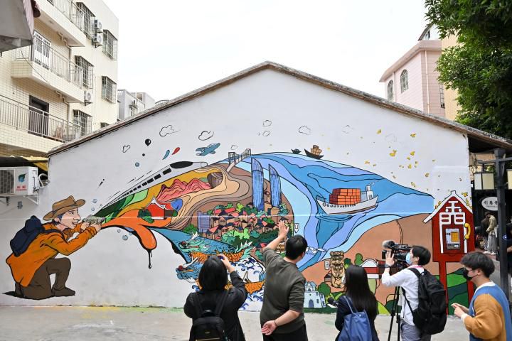 在百年街區集美大社,幢幢閩南紅磚厝古韻猶在。一周來,在這些老墻上,兩岸藝術家創作出多幅構思巧妙的涂鴉作品。其中一幅名為《海峽一日游》,展現了廈門港、“雙子塔”以及莒光樓等廈門、金門兩地景點,浮雕刻畫,栩栩如生。