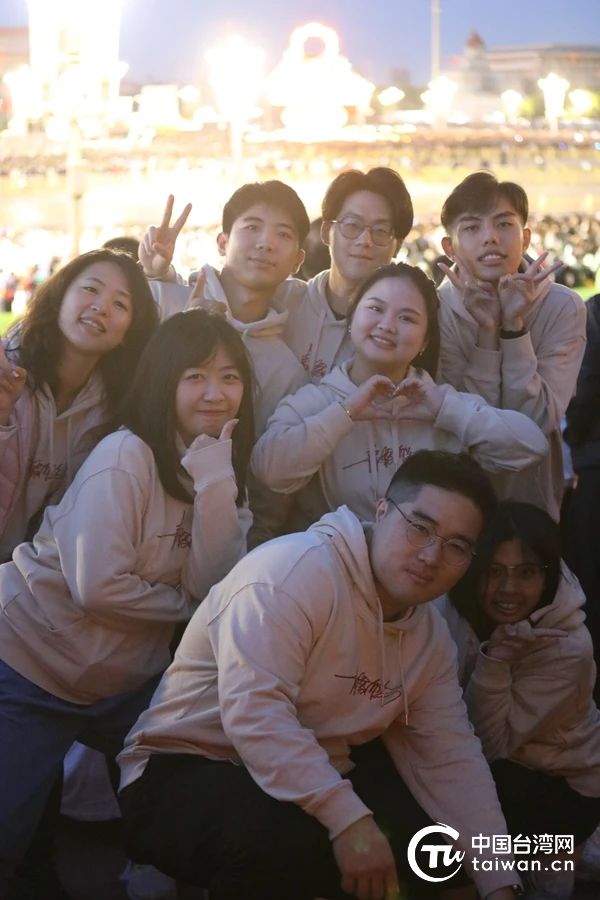 10月1日,來自北京、上海、廣州、福建等地高校的44名臺灣學生來到北京天安門城樓東側觀禮臺觀看升旗儀式。(林家緯 供圖,中國臺灣網 發)