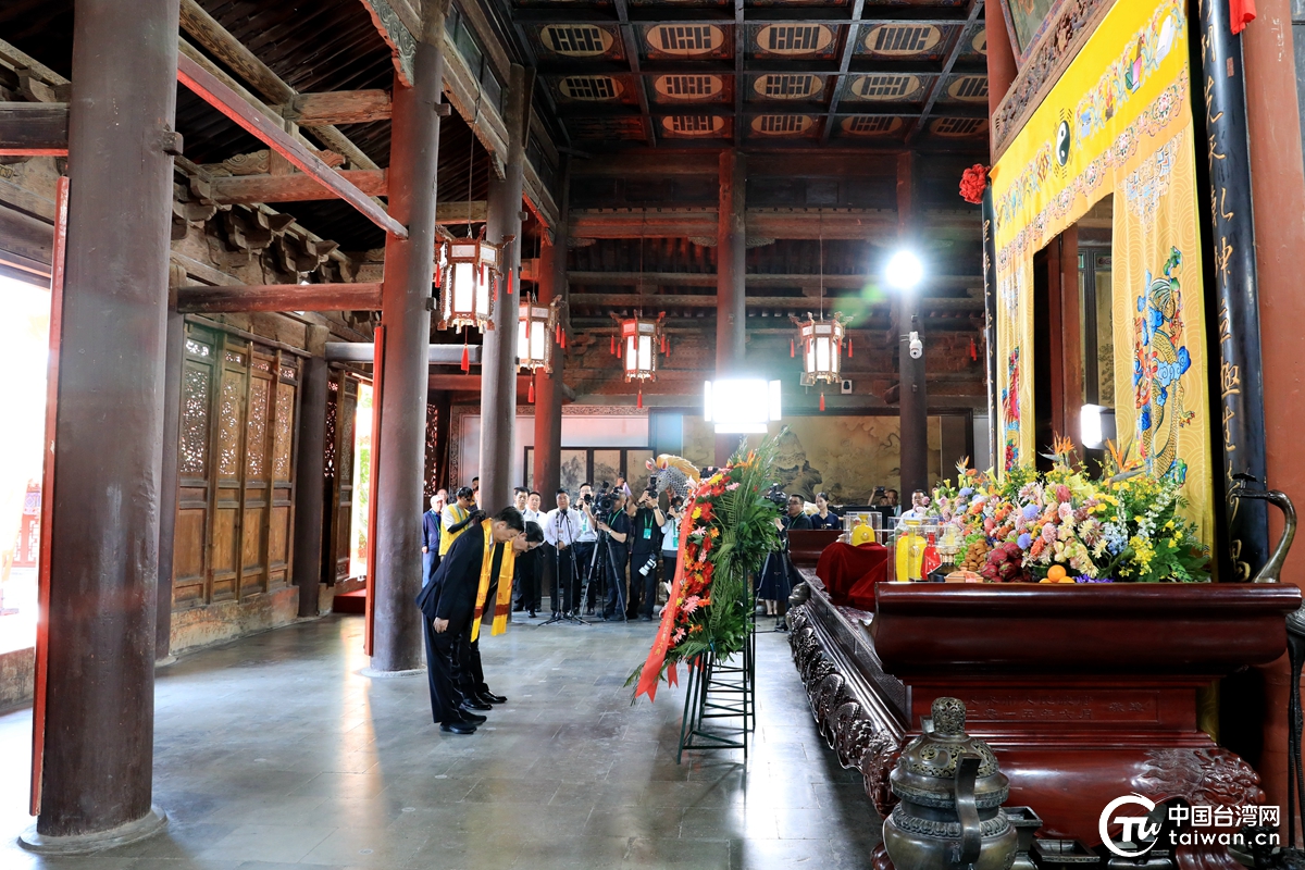 馬英九同宋濤進入伏羲廟,拜謁祖廟,敬獻花籃,寄托追思與尊崇之情。(中國臺灣網記者 尹賽楠 攝)