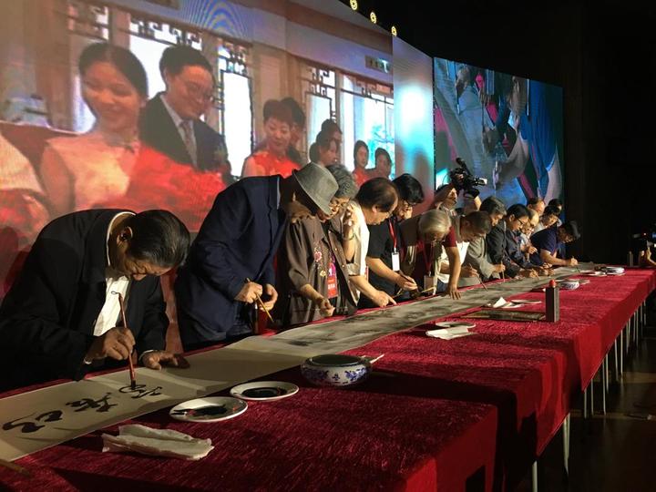 一直以來,兩岸書畫藝術界人士都有一個共同的愿望:共繪新《富春山居圖》。在這個特殊的日子,肖鋒、余子安、羅小庵、張德文、宋柏松、王為民、羅永貴、陳梅香、羅正賢、白宗人、游世河、何堯文等12位兩岸藝術家上臺,共同揮毫創作了一幅新《富春山居圖》。