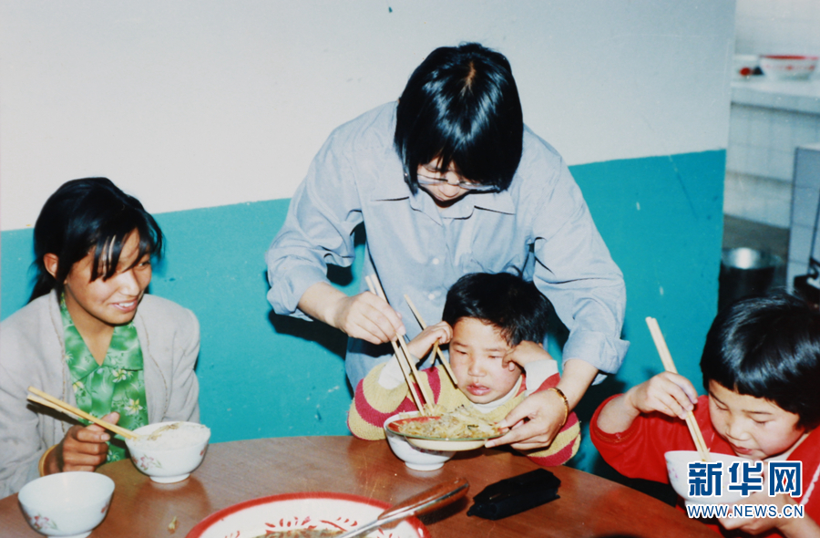 2002年,張桂梅在“兒童之家”照顧孩子們吃飯(資料圖)。新華網(wǎng)發(fā)(華坪縣融媒體中心 供圖)