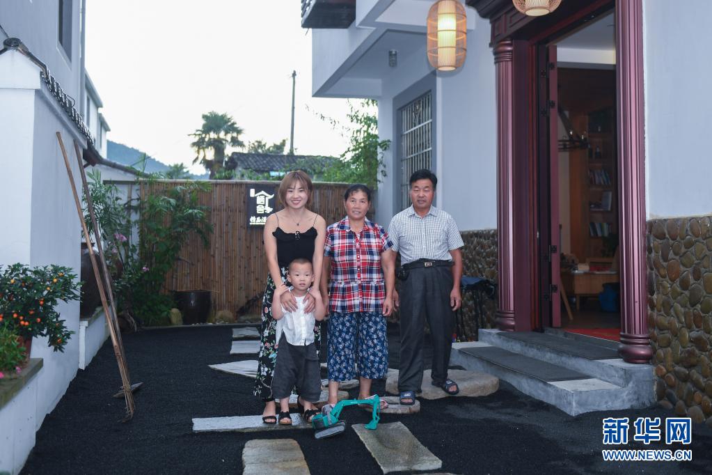 2017年8月9日,在浙江省淳安縣楓樹嶺鎮下姜村,村民姜麗娟(左一)與父親姜北方(右一)、母親王洋球(中)及兒子安安在自家開辦的“棲舍”民宿院內合影。新華社記者 黃宗治 攝