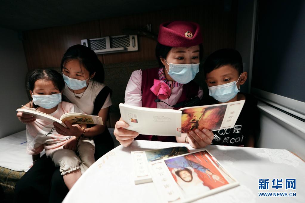 7月25日,在南昌開往北京的D738次列車上,列車長曾穎為小朋友講革命故事。