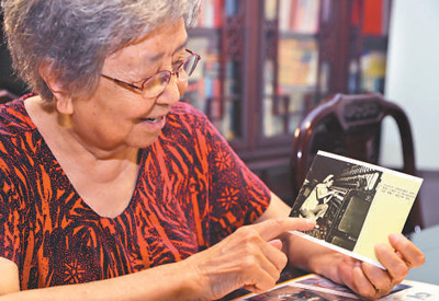 黃寶妹在上海的家中翻看自己做紡織女工時的老照片(六月十日攝)。