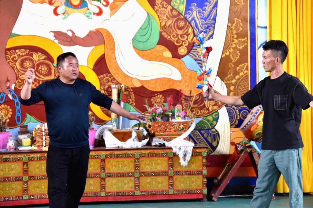 扎西曲登社區雅礱扎西雪巴藏戲團在村里為游客表演藏戲(2021年7月15日攝)。新華社記者陳尚才 攝