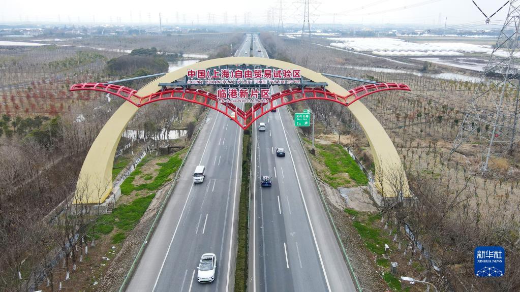 S2滬蘆高速上的中國(guó)(上海)自由貿(mào)易試驗(yàn)區(qū)臨港新片區(qū)“海鷗門”(2月10日攝,無(wú)人機(jī)照片)。新華社記者 方喆 攝