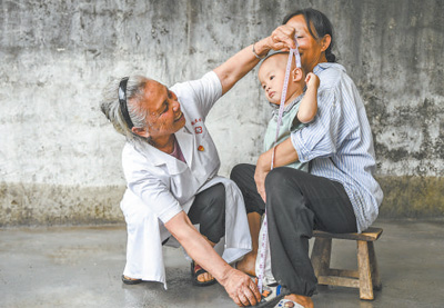廣西壯族自治區(qū)賀州市鐘山縣兩安瑤族鄉(xiāng)竹梅村的鄉(xiāng)村醫(yī)生上門進(jìn)行體檢服務(wù)時(shí)給小朋友測(cè)量身高。